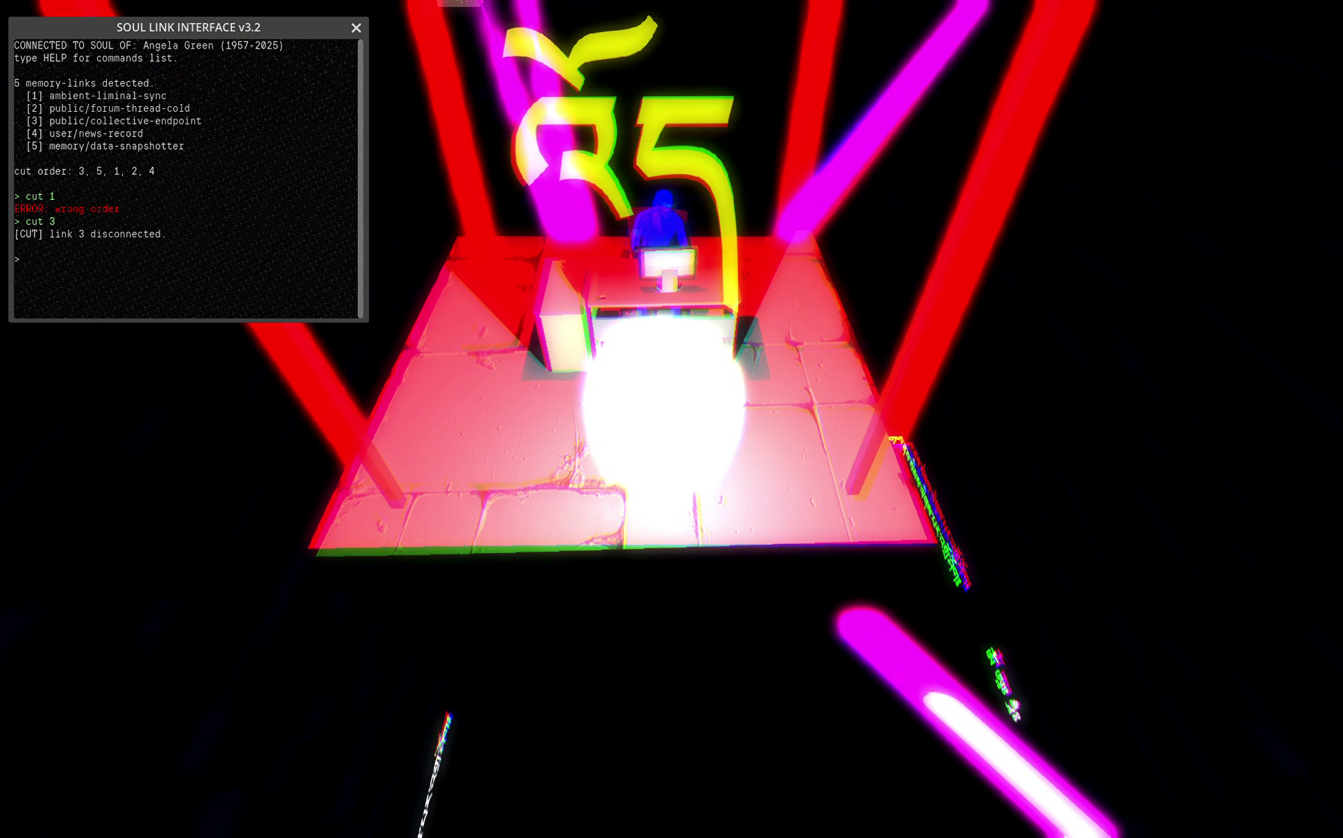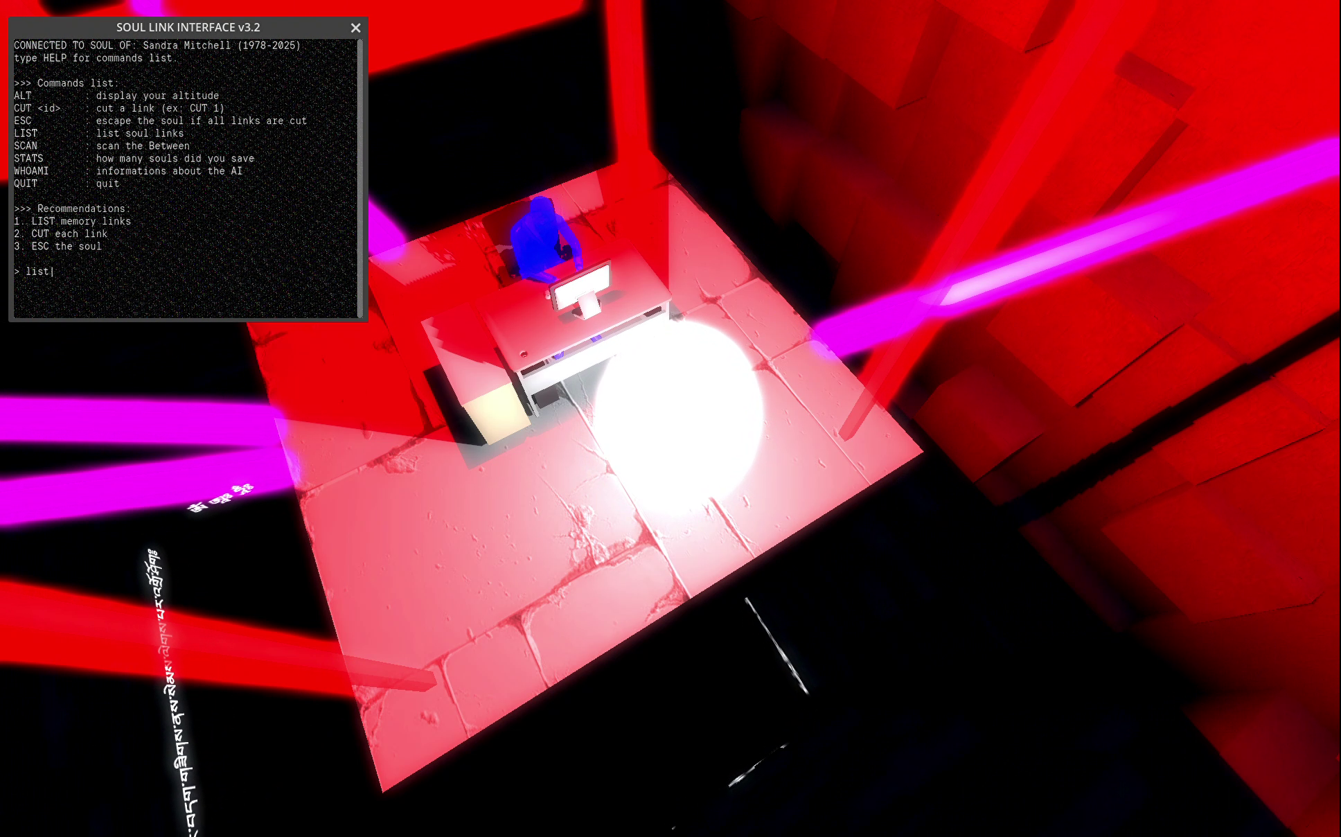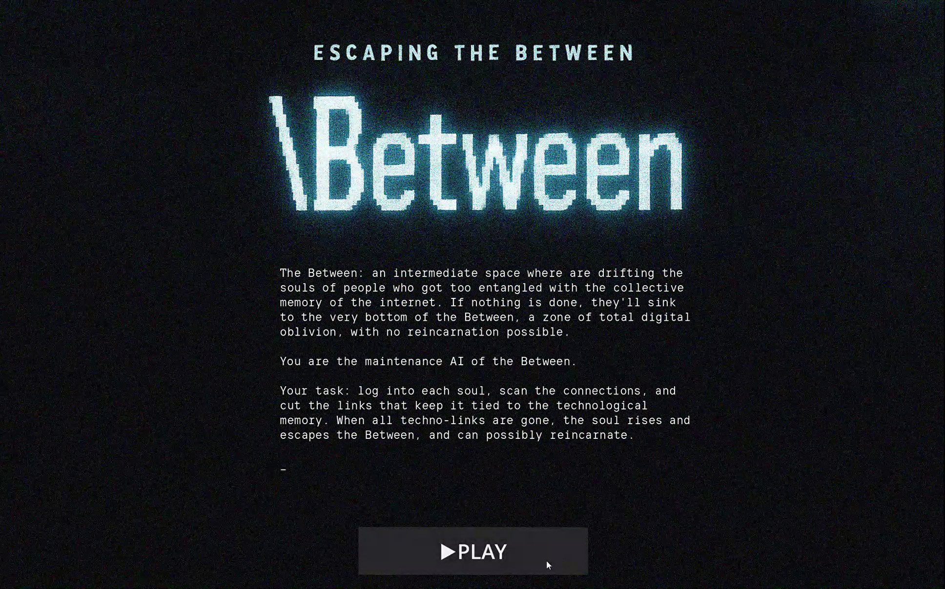 Your task: log into each soul, scan the connections, and cut the links that keep it tied to the technological memory. When all techno-links are gone, the soul rises and escapes the Between, and can possibly reincarnate.